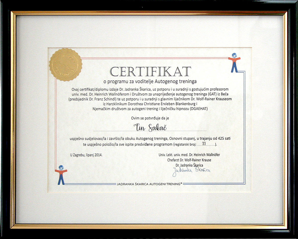 Zovem se Tin Sakač. Rođen sam i živim u Zagrebu. Akademski sam obrazovan. Završio sam Omni Hypnosis Training Center of Slovenia (OHTC of Slovenia), slovensku podružnicu američke škole hipnoze OHTC, utemeljene 1979. godine. Ujedno sam i član američkog Saveza za hipnoterapiju (National Board of Hypnosis) i Hrvatskog društva za autogeni trening, hipnozu i terapiju (Croatian Association for Autogenic Training, Hypnosis and Therapy). Certificirani sam voditelj Autogenog treninga (Jadranka Škarica, Zagreb; Društvo za unaprijeđenje autogenog treninga, Beč; Njemačko društvo za autogeni trening i liječničku hipnozu, DGAEHAT), certificirani Waldorfski pedagog (Učiteljski fakultet Sveučilišta u Zagrebu) te Stručni prvostupnik (Baccalaureus) predškolskog odgoja (Učiteljski fakultet Sveučilišta u Zagrebu).